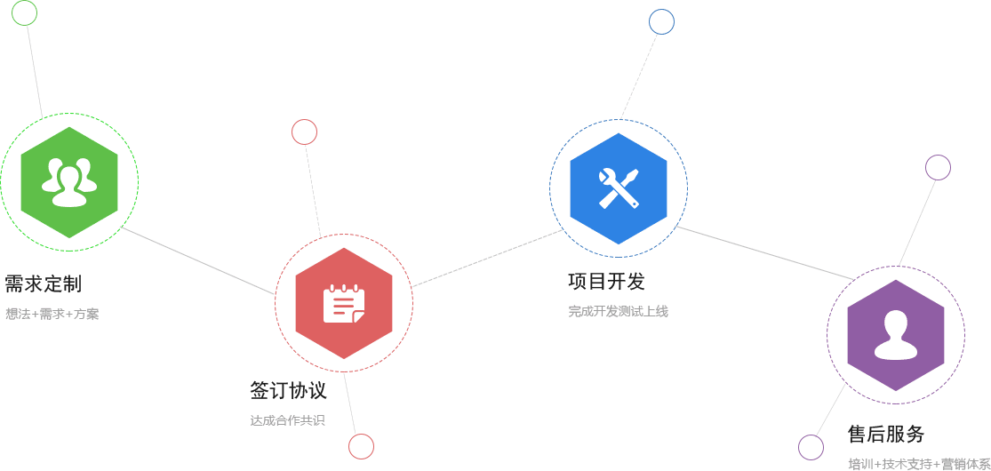 提供開發需求 -> 達成合作協議 -> 完成需求開發 -> 售后服務